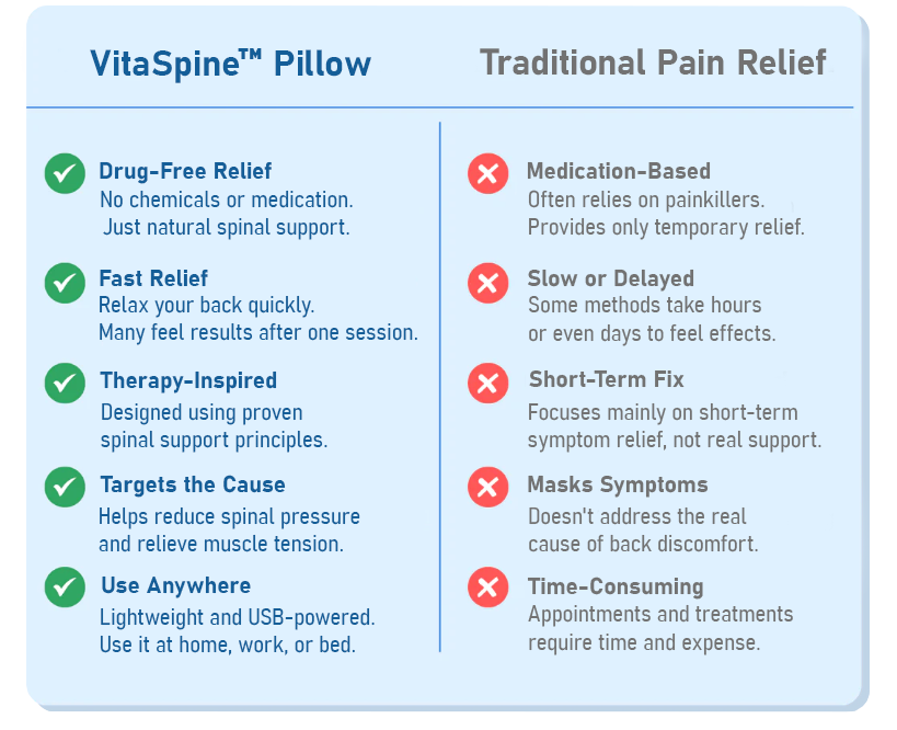 If you've tried heating pads, ordinary pillows, and even multiple doctor visits without long-term relief, you're not alone. Most solutions only address one part of the problem. VitaSpine™ is designed as a powerful 3-in-1 system, combining heat therapy, vibration massage, and spinal decompression to help target the key causes of chronic back pain at the same time.
